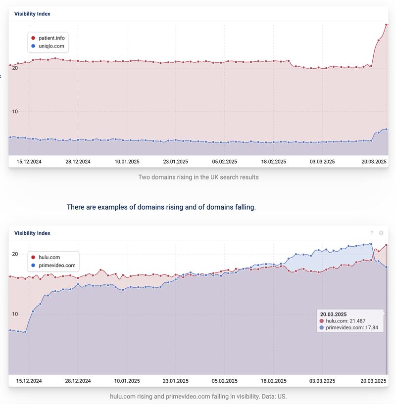 - Patient.info, a health website, suddenly went up a lot in March 2025. Maybe more people are searching for health advice, or the website is adding helpful content.